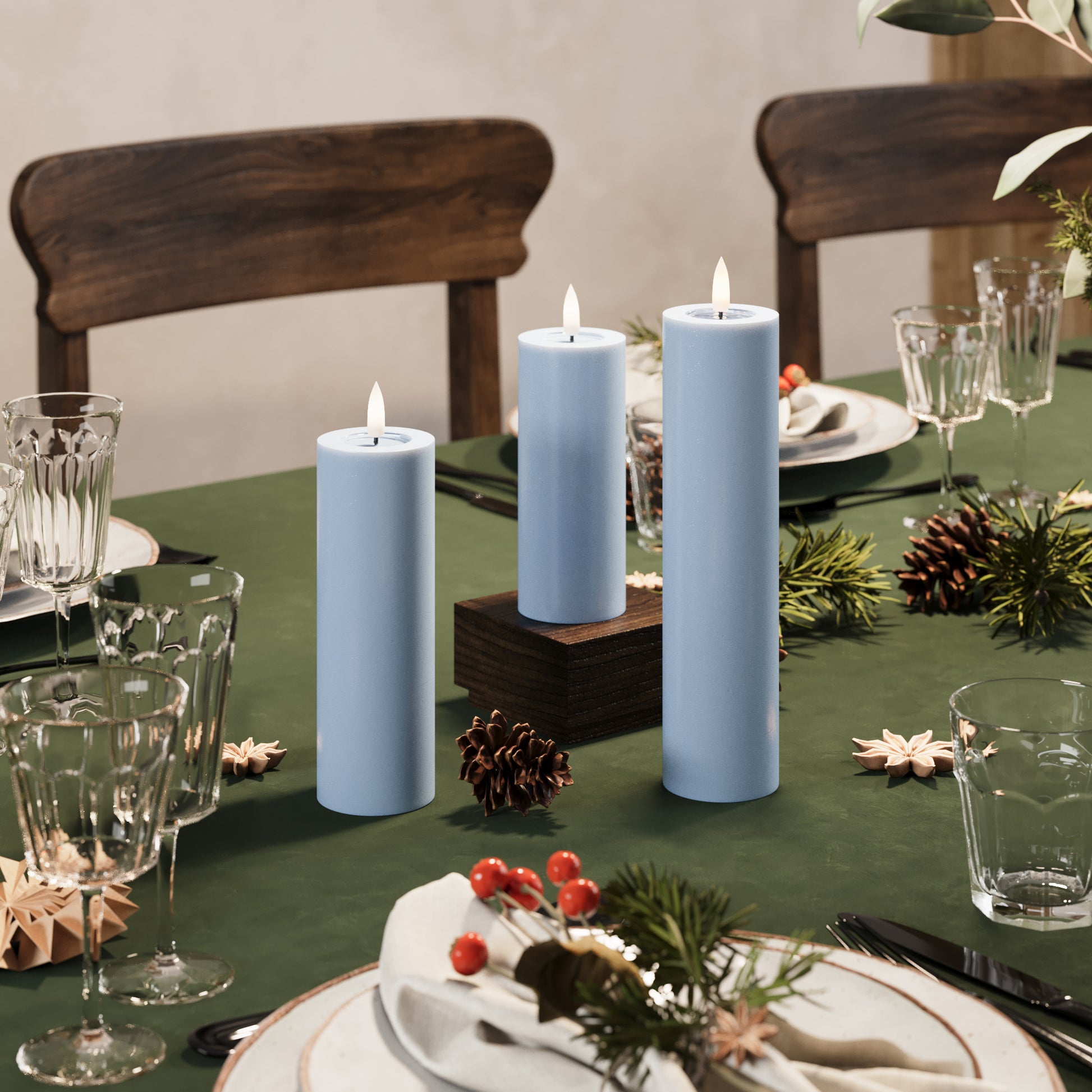 Dette er en pakke med LED bloklys i farven Isblå i flere størrelser.