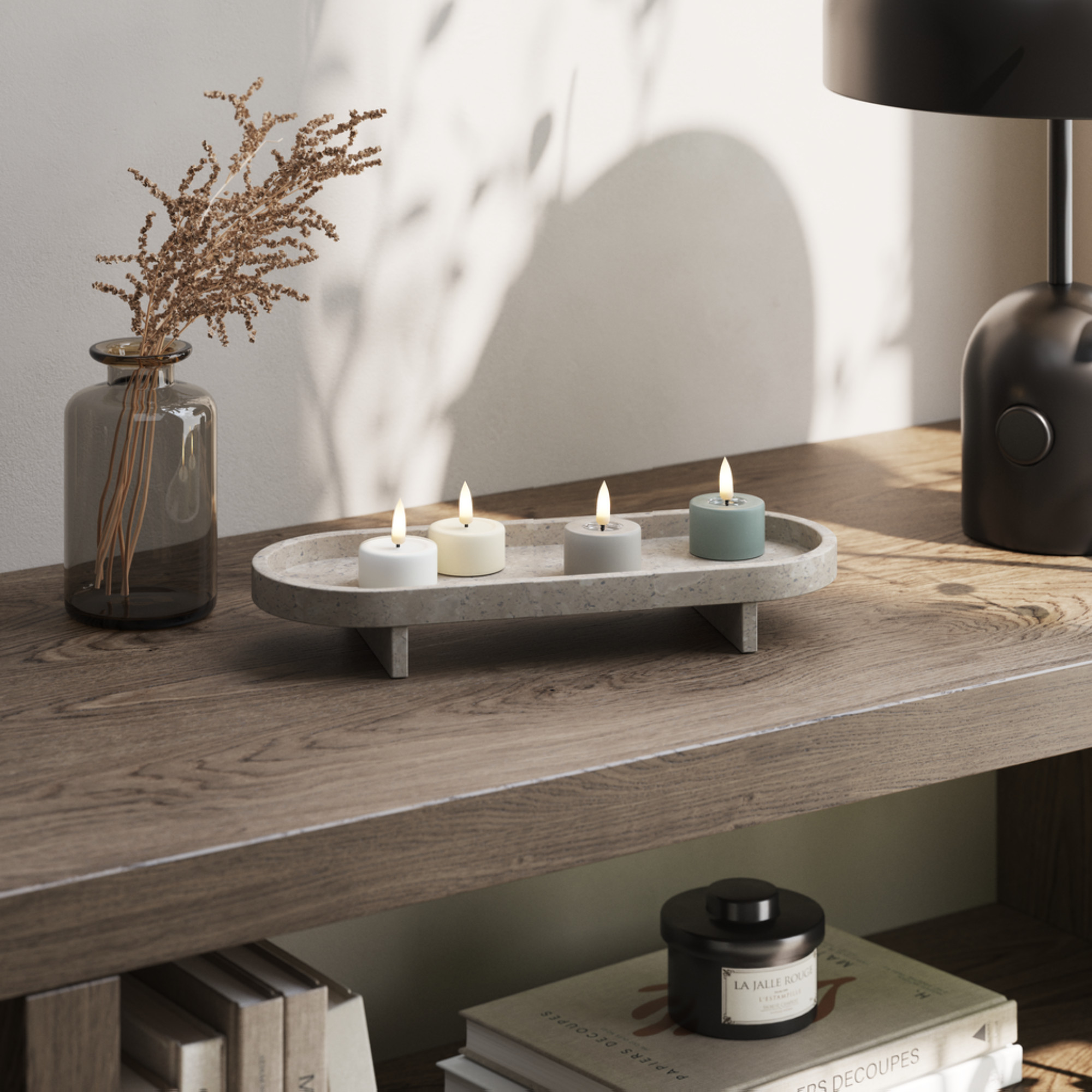 Vores lys er omhyggeligt designet med en resin-top, der skaber en autentisk effekt, som om lysene har brændt i et stykke tid. Denne særlige egenskab gør vores lys utroligt realistiske, især når flammen kaster sit varme skær på resinoverfladen.