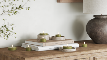 For et roligt helhedsindtryk kan du samle lysene på et fad og variere højderne, mens farverne holdes i samme palette.