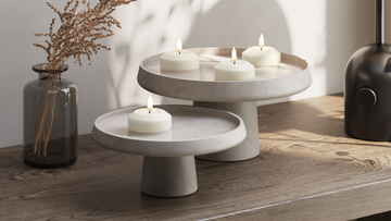 For et rolig helhetsinntrykk kan du samle lysene på et fat og variere høydene, samtidig som du holder fargene i samme palett.